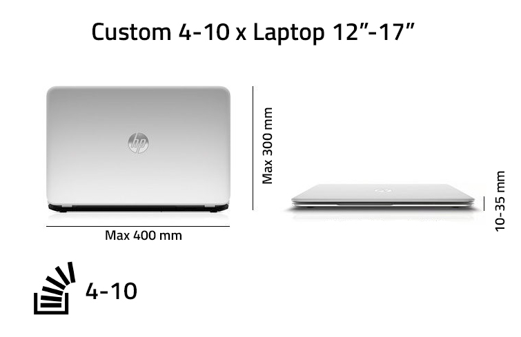 - Dimension of Laptop. Wide: Max 400 mm, Depty Max 300 mm, Height: 10-35 mm